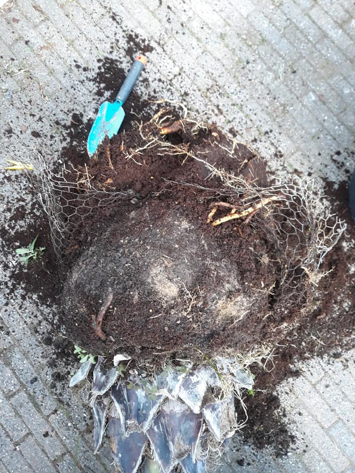 Na de enorm zware kuip thuis op zijn plek gezet te hebben wilde ik het gaas wegknippen. Tot mijn schrik zag ik dit verder in de kuip gaan. Palm uit de kuip gehaald te hebben zag ik dat de palm uit de grond was gehaald en met kippengaas was omwikkeld en in de pot gedrukt met wat verse grond. De grond was een puingrond van grote stukken baksteen met vieze drap klei. Dit voorzichtig te hebben verwijderd met water de palm weer terug geplaatsts met goede grond. Eerst maar is een goede kwaliteit kluit vormen, later uitplanten.