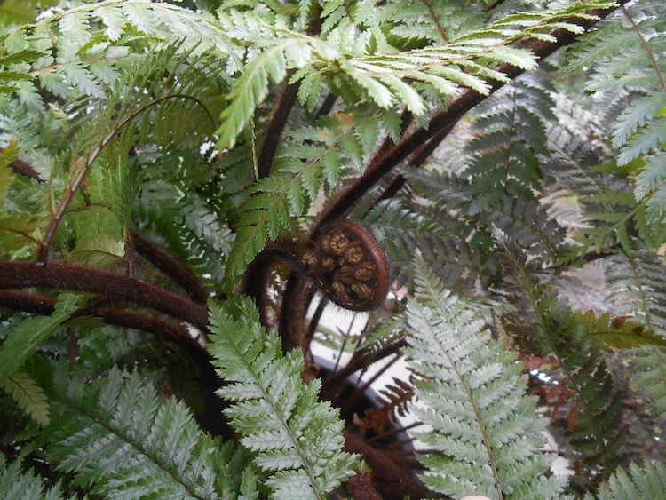 Diverse varens die in de kas overwinteren lopen al uit. Ook Dicksonia squarrosa krijgt nieuwe veren. Blijkbaar zijn de nachten nog te koud getuige de schade bij het raam aan de eerst ontwikkelde veder. Overigens is er alweer een volgende op komst.