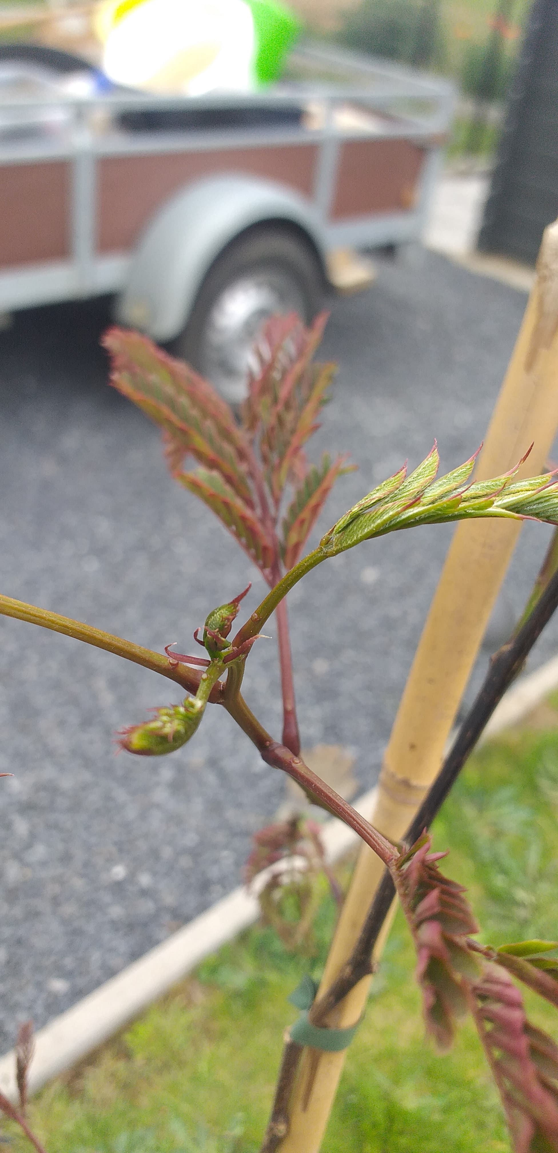 Een zwarte stam herken ik niet tenzij het hout is afgestorven. Het jonge hout is donkerder van tint dan bij de gewone julibrissin. Summer Chocolate afkomstig uit de kas ervaart nog hinder van de IJsheiligen maar is al iets verder dan de de Evi's Purple en Pride in de tuin