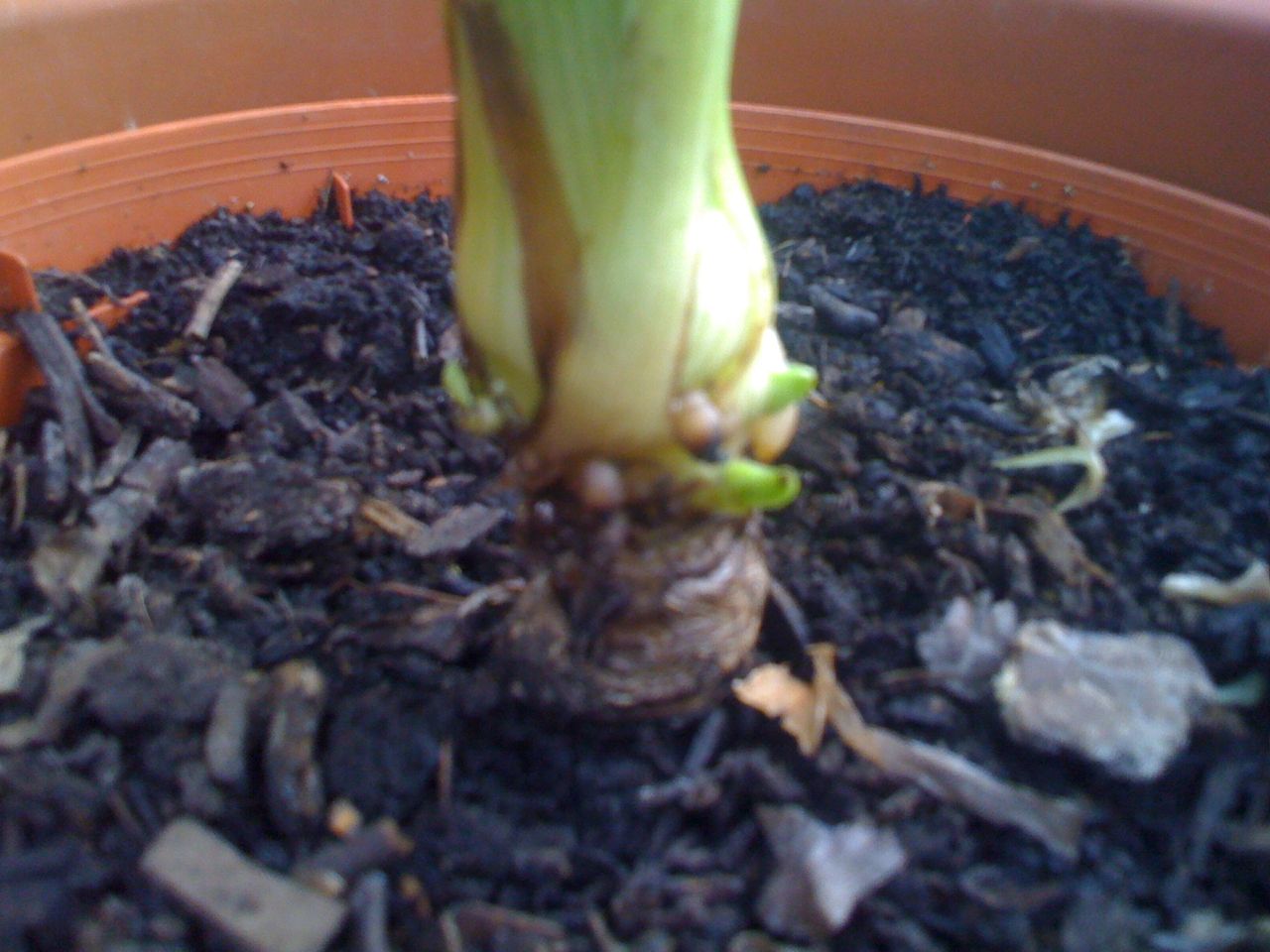 Na zonder enige voorkennis een beetje liggen na te piekeren, denk ik dat ik weet wat er gebeurd is. Volgens mij is de stam (dorre bladeren) te nat geweest waardoor die vanonder is beginnen rotten, het gedeelde er vlak boven heeft dan gedacht dat hij dieper geplant is geweest (wegens de natte donkere omhulsels) en is wortels achter deze natte bruine bladeren beginnen schieten. Zou dit niet kunnen?