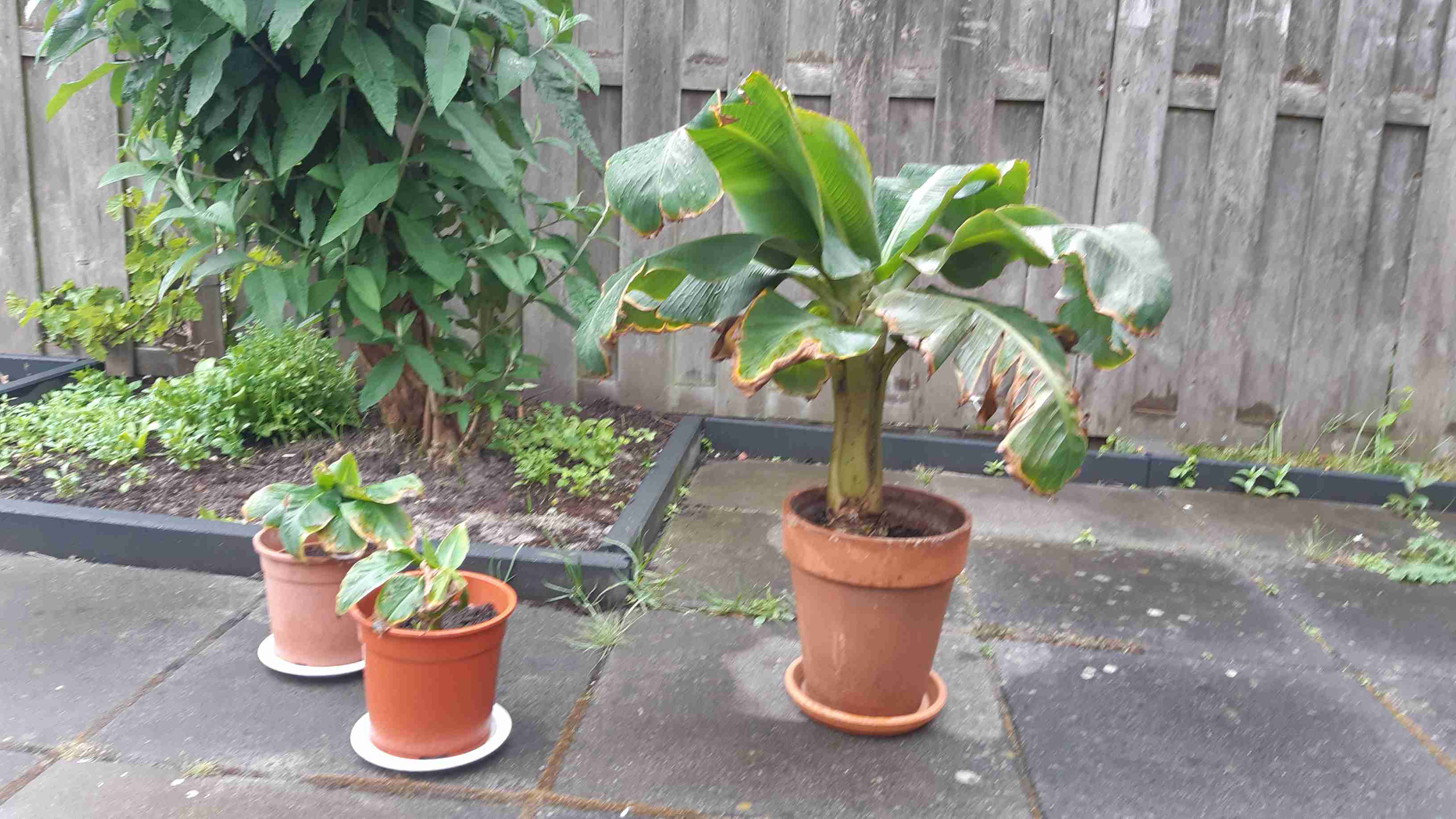 Mijn musa dwarf heeft verschillende bladeren slap hangen. Hij staat normaal binnen voor het raam en krijgt veel licht/zon. Op warme dagen staat ie buiten. Hij ktijgt voldoende water. Krijgt ie te veel zon/water waardoor de bladeren slap hangen?