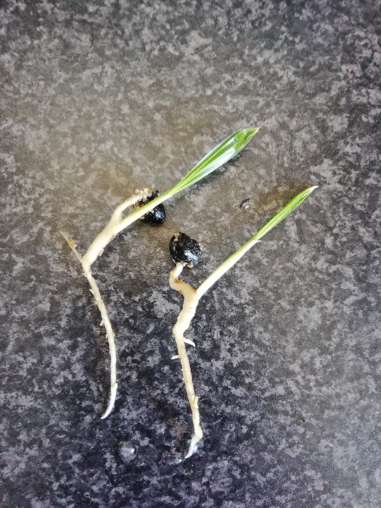 Verder heb ik drie zaden in een magnetron schaal met vermiculiet gedaan en bij een raam gezet waar overdag lekker veel zon op staat, als-ie schijnt tenminste. Daar ben ik wat vaker in gaan spieken. Op enig moment was er een klein puntje te zien. Het is dan lastig om niet elk uur te kijken of er meer te zien is. Al vrij snel was er zelfs groen zichtbaar bij één van de drie zaden. Mijn mini Palm was een feit! Bij de tweede zag ik minimale groei en de derde deed niks. Ik was al blij met het resultaat van het eerste groene puntje. Uiteindelijk liet nummer twee ook groen zien terwijl nummer drie er roerloos bij lag, begin van deze week . Vandaag, vijf dagen later, opnieuw gekeken en mijn mini palmpje is toe aan een nieuw huis. Bij de minste geringste groei raakt hij het dak, dat laat ik niet gebeuren. Nummer twee kan mee verhuizen, want dat begint ook al ergens op te lijken. Nummer drie leek er nog steeds roerloos bij te liggen. Nieuwsgierig als ik ben heb ik voorzichtig het laagje vermiculiet eraf gehaald en ben nog voorzichtiger gaan graven. Dit heb ik onlangs ook gedaan bij mijn Monstera stekje waar ik niets zag gebeuren, onder de grond trof ik toen prachtige wortels aan. Inmiddels is mevrouw Monstera dolgelukkig en heeft mijn nieuwsgierigheid beloond met veel nieuwe bladeren. Je kunt het al raden, nummer drie lag er niet roerloos bij! Als dit net zo gaat als met de Monstera wordt dit mijn pronkstuk.