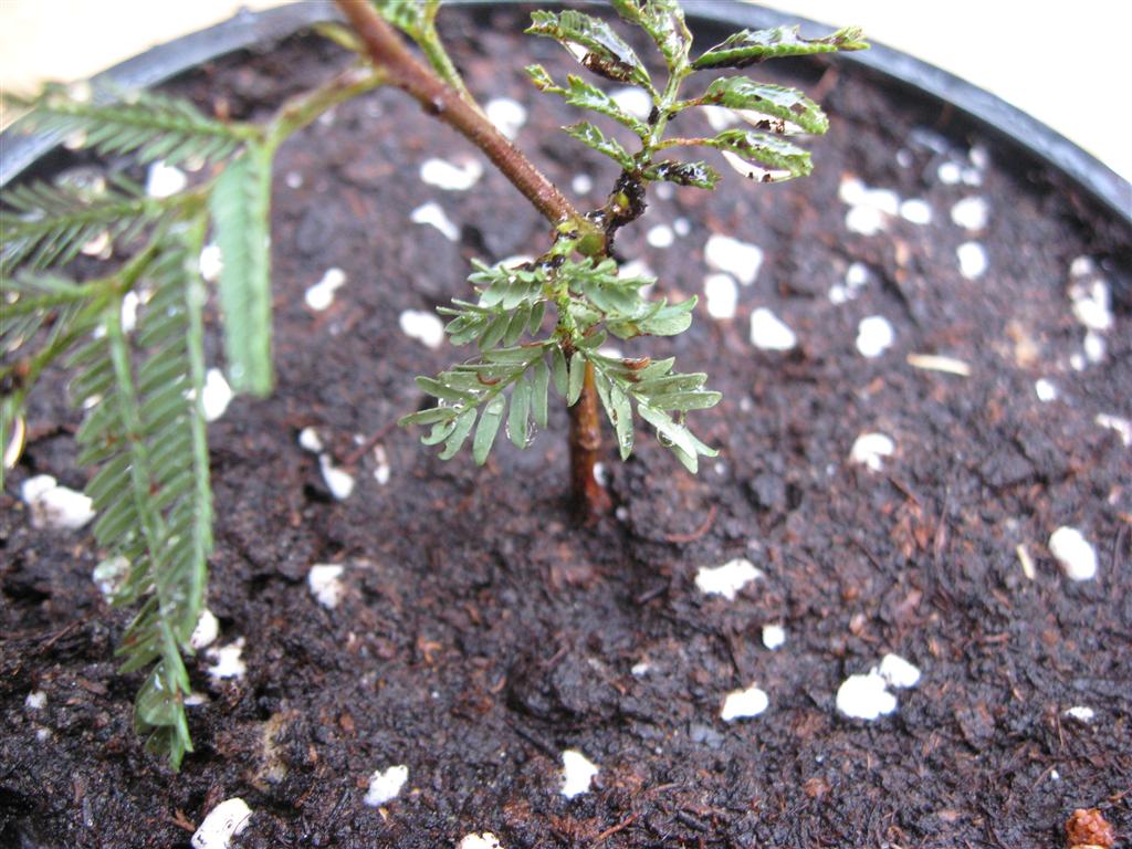 Of de blaadjes zich 's nachts dichtvouwen heeft men niet opgelet. Van de stekels wisten ze ook niet en ik zie er nu ook nog geen. Hopelijk dat ie door de verhuizing heen gaat komen en in dit potje aanslaat...