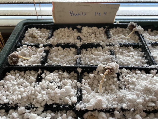 Je kunt de reeds gekiemde zaden al oppotten, ofwel opnieuw iets dieper in het huidige medium zetten (in beide gevallen zaad gelijk met maaiveld.