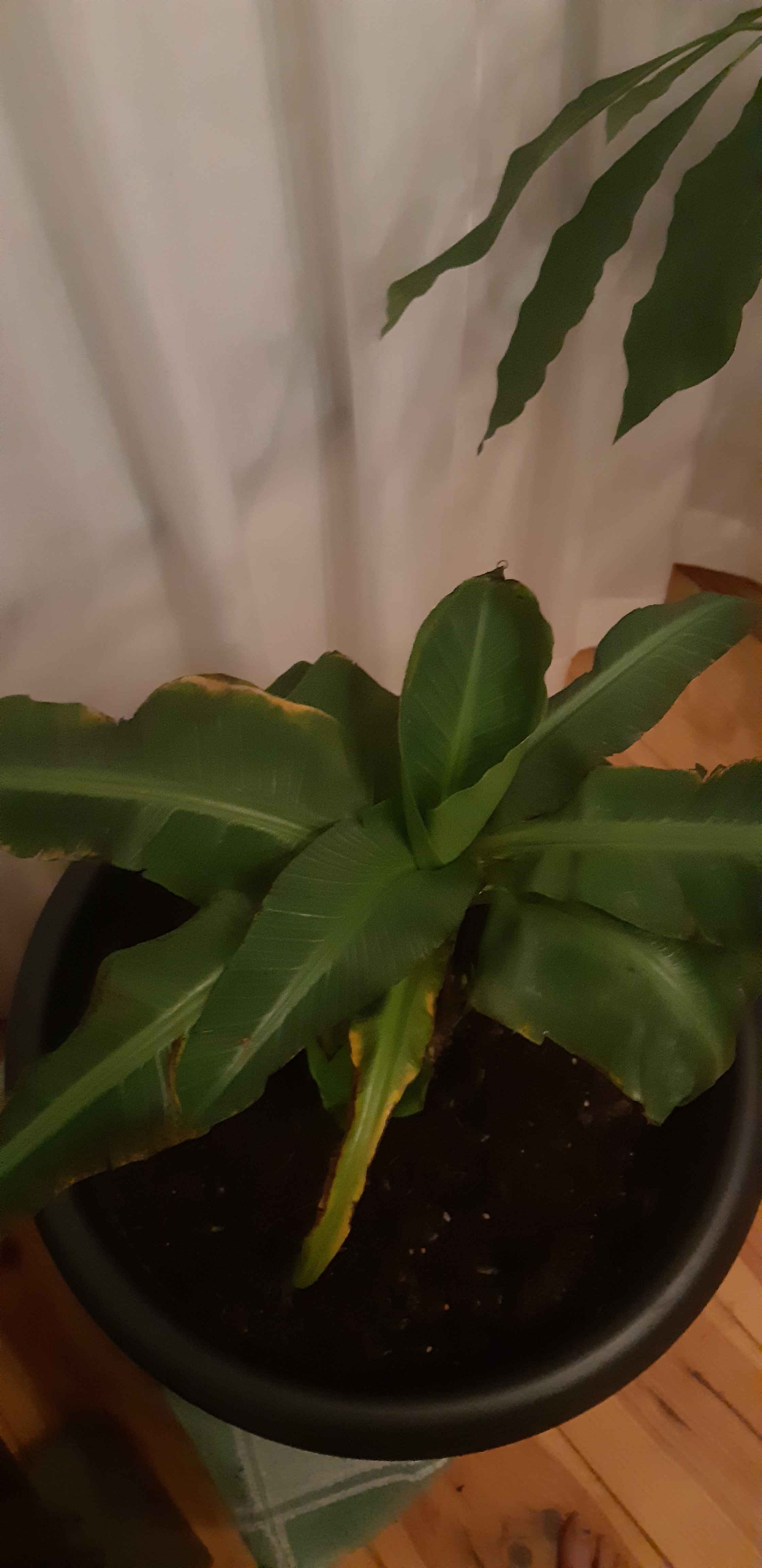 Een banaan heeft zijn bladeren dicht op elkaar als deze weinig licht krijgt. Bij jou plantje is dit goed te zien. Dus ik denk dat deze eerder niet zo veel licht kreeg en nu plots teveel waardoor deze bladeren verbranden.