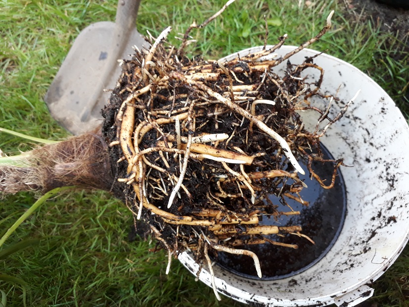 Je zou kunnen zien hoe de wortelkluit eruit ziet in maart/april en dan terug in volle grond.