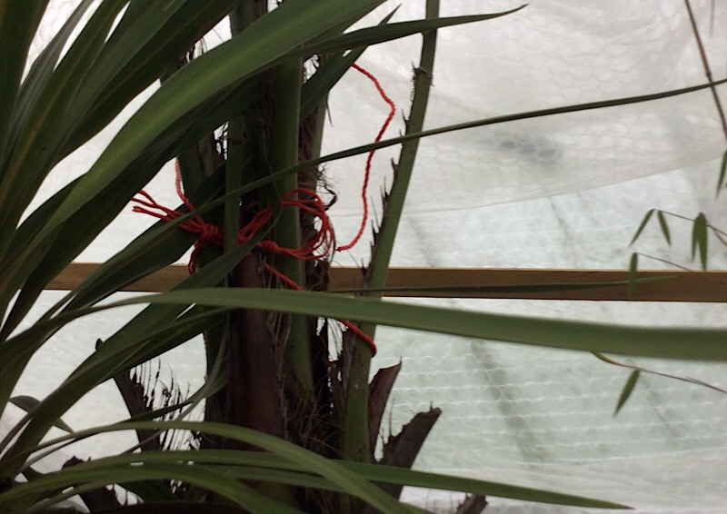 Keer staat ook (min of meer perongeluk) oa een Cordyline onder en bamboe. Diameter van de constructie is meer dan 3 meter. Op de 2e foto de musa basjoo ingepakt en een jubea chilensis (houtwerk met zeil aan de bovenkant om droog te houden en boomjas er omheen) Op de derde nog meer musa basjoo en o.a. een onbeschermde lagerstroemiaboom op de achtergrond.