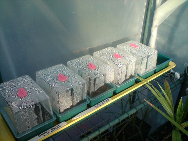 Hier staan de bakken en potjes die al zo lang staan dat ik er eigenlijk niet meer naar omkijk. Soms heeft dat een positief resultaat zoals de Jubaea's (rechtsvoor), die na 18 maanden eindelijk zijn gekiemd. Erachter nog een pot met Jubaea's, Sabals,... Helemaal links achter staat een bak met ventricosum zaden die al een jaar of 2 liggen :shock: