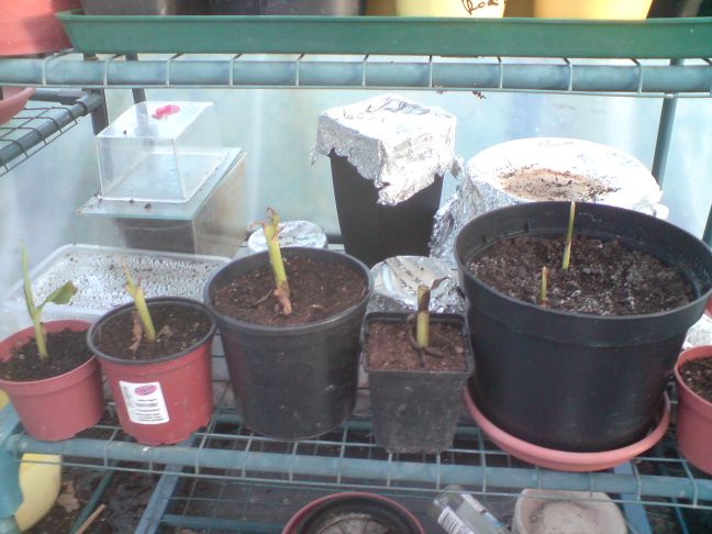 Enkele Canna soorten. In het middelste bakje zitten Strelitzia nicolai's.