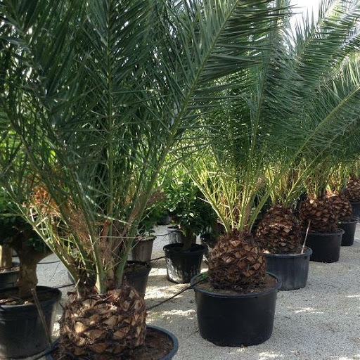 grote palmen in kleine(re) potten ,op de palmfarms worden ze met speciale machine uitgegraven (gesneden) zodat een zeer klein gedeelte maar over blijft voorin pot.