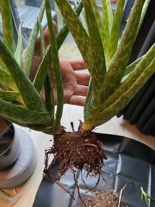 Aangezien mijn Aloe Vera uit twee stammen bestaat en ze inmiddels meer naar de zijkant groeien dan naar boven, dacht ik, misschien is het handiger om hem uit te graven, ze te scheiden, en allebei een eigen pot te geven. Maar toen ik vanmorgen het zand verwijderde zag ik dat het gaat om één compacte basis. Ik neem aan dat ik hier niets mee kan/moet doen -- dat beide planten bij het doormidden snijden van de basis komen te overlijden?