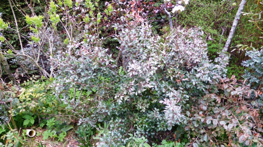 Dit is de derde, die is wat breder uitgegroeid. Er zitten wel een paar dode takjes/blaadjes aan maar heel weinig. De plant rechtsonder is een Loropetalum, die kan wat minder tegen de kou, maar overleeft het wel.