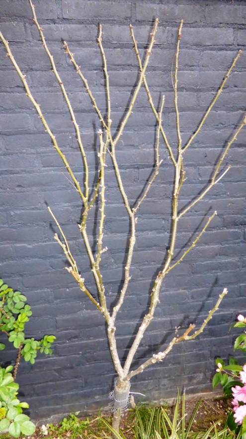 Op een wat beschuttere plek heb ik een Ceasalpinia gillesii staan. Die vertoont nog geen tekenen van ontwaken, maar hij lijkt nog wel in leven. Ik heb er ook een die in de kas heeft overwinterd en die is wel aan het uitlopen. Bloeit ook elk jaar, maar echt mooi vind ik het niet.