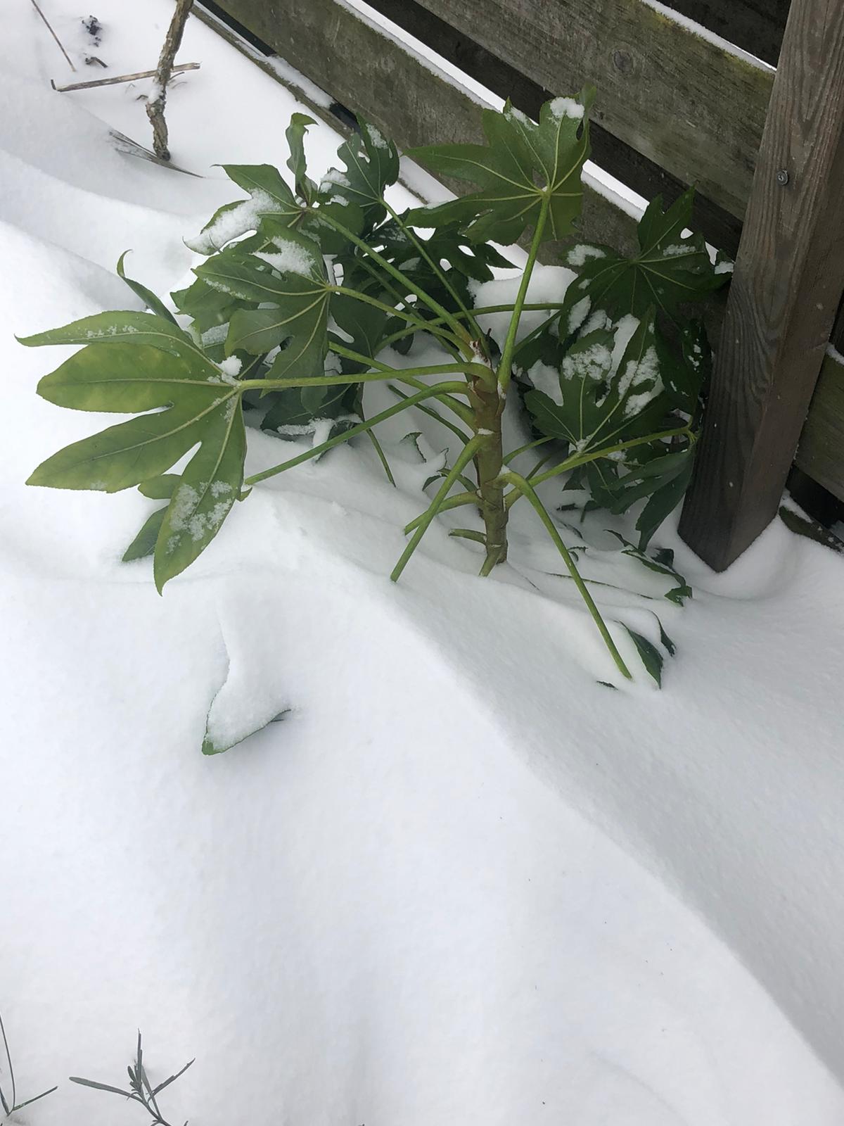 Goed bezig! ik zou die Fatsia gewoon onder de sneeuw begraven. Dan maakt ie wellicht meer kans dan zo erboven.