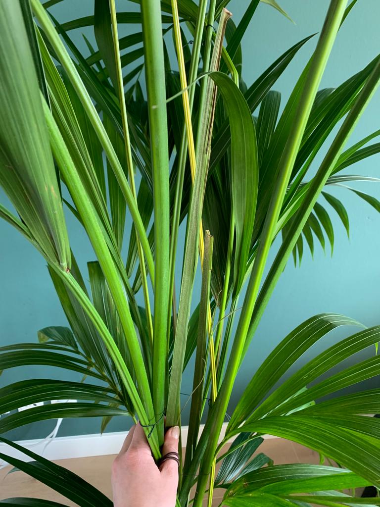 Ik heb in januari een prachtige Kentia palm van 2.5 meter gekocht. Nu merk ik dat de groei van de bladeren stagneert en er een aantal bladeren afsterft. De stengels zijn bruin (zie foto).