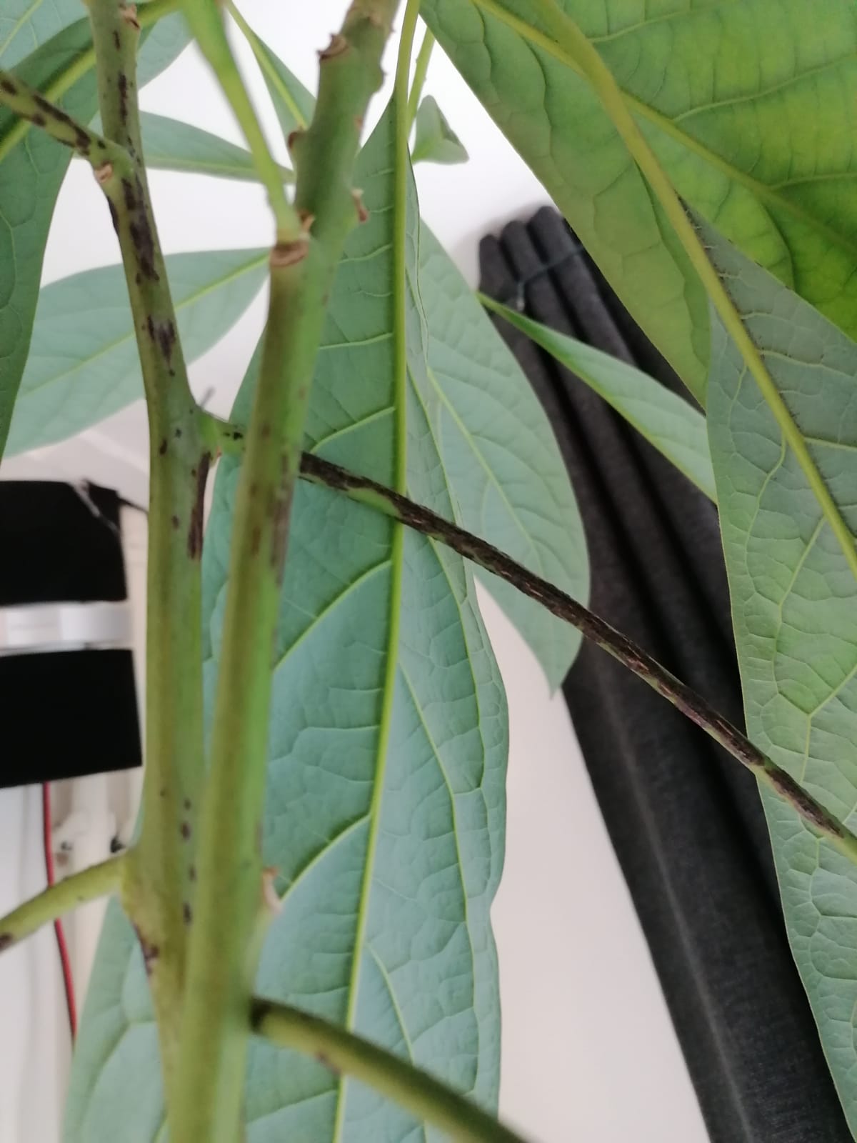 Mijn avocadoplant (+/- 5jr) vertoont sinds kort donkere plekken zoals op de foto te zien is. Twee zijtakken en een klein stukje van de hoofdstam heeft hier last van. De plant groeit voor de rest zonder problemen en de bladeren hebben ook geen bruine punten of brandplekken. Foto 1 is een closeup van de linker (grote) avocadoplant die te zien is op foto 2. Wat kan het zijn en moet ik actie ondernemen?