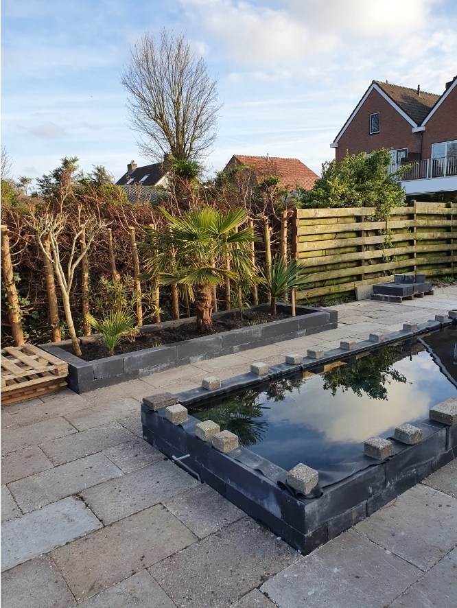 Randen van de vijver ook klaar. Eerste palmen geplant