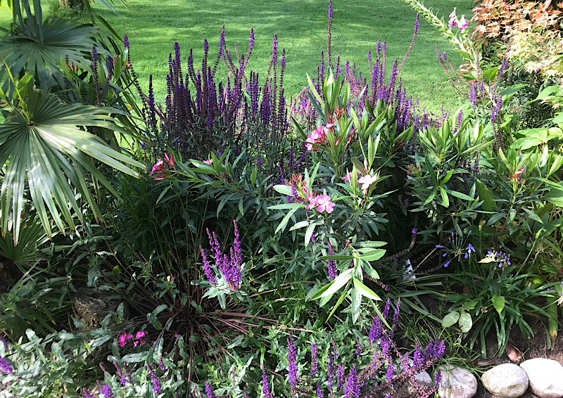 De rechter zijde van het terras. De oleanders zijn een beetje overwoekerd door de salvia.