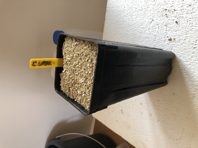 Vandaag heb ik de eerste gekiemde opgepot, en er zijn al een paar andere onderweg. Als substraat gebruik ik 40/40/20 Seramis/fijne denneschors/klei korrels. Daarbovenop heb ik dan de kiemling geplaatst en alles afgedekt met vermiculiet. De pot is ongeveer 20cm diep, hopelijk is dat voldoende. Net zoals Phoenix sp. sturen deze palmen een eerste diepe wortel uit.
