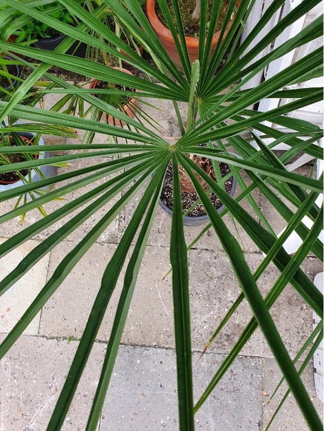 Haast gedacht dat de palm die ik als Trachycarpus princeps NEW FORM had gekocht er niet eentje was, aangezien er bijna geen witte waslaag op de onderkanten van de bladeren zat.