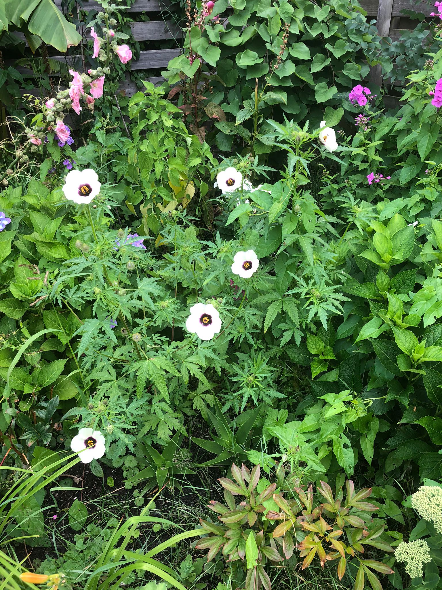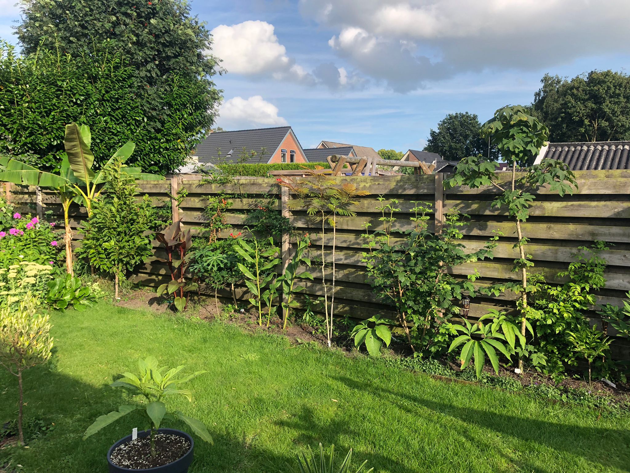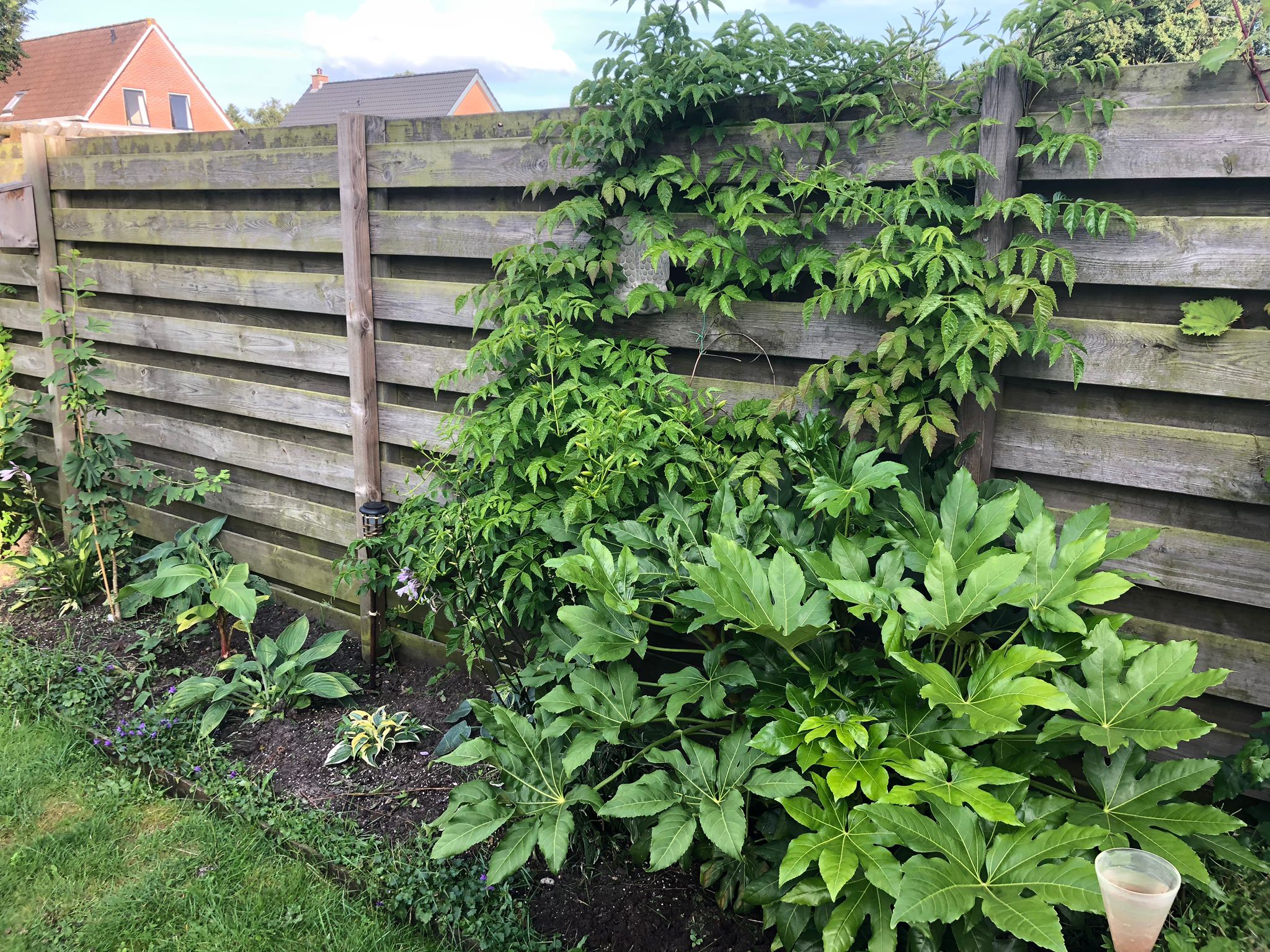 Overzichtje. De gember heeft 8 nieuwe groeipunten! En de Canna begint ook steeds breder nieuwe uitlopers te maken. Volgend jaar mooie volle bossen. Tussen de Magnolia en de Canna komt nog een Melianthus major die ik nu in opkweek heb. Alle Albizia's vallen tegen dit jaar. Normaal tijdens een periode van hitte veel (regen)water geven en ze groeien als een gek. Veel water maar helaas geen hitte. De Evi's pride is heel kort op kleur geweest maar helaas is de kleur nu weer steeds minder aan het worden. Moet nog een beetje opvulling hebben rond de Evi's pride, iemand suggesties? Ongeveer hetzelfe idee als ik met de Sauronatums doe bij de Kalopanax. Manihot begint nu pas te vlotten, wat stekken proberen en deze eronder zetten. Dan is het een voller geheel, het gaat immers toch om het blad.