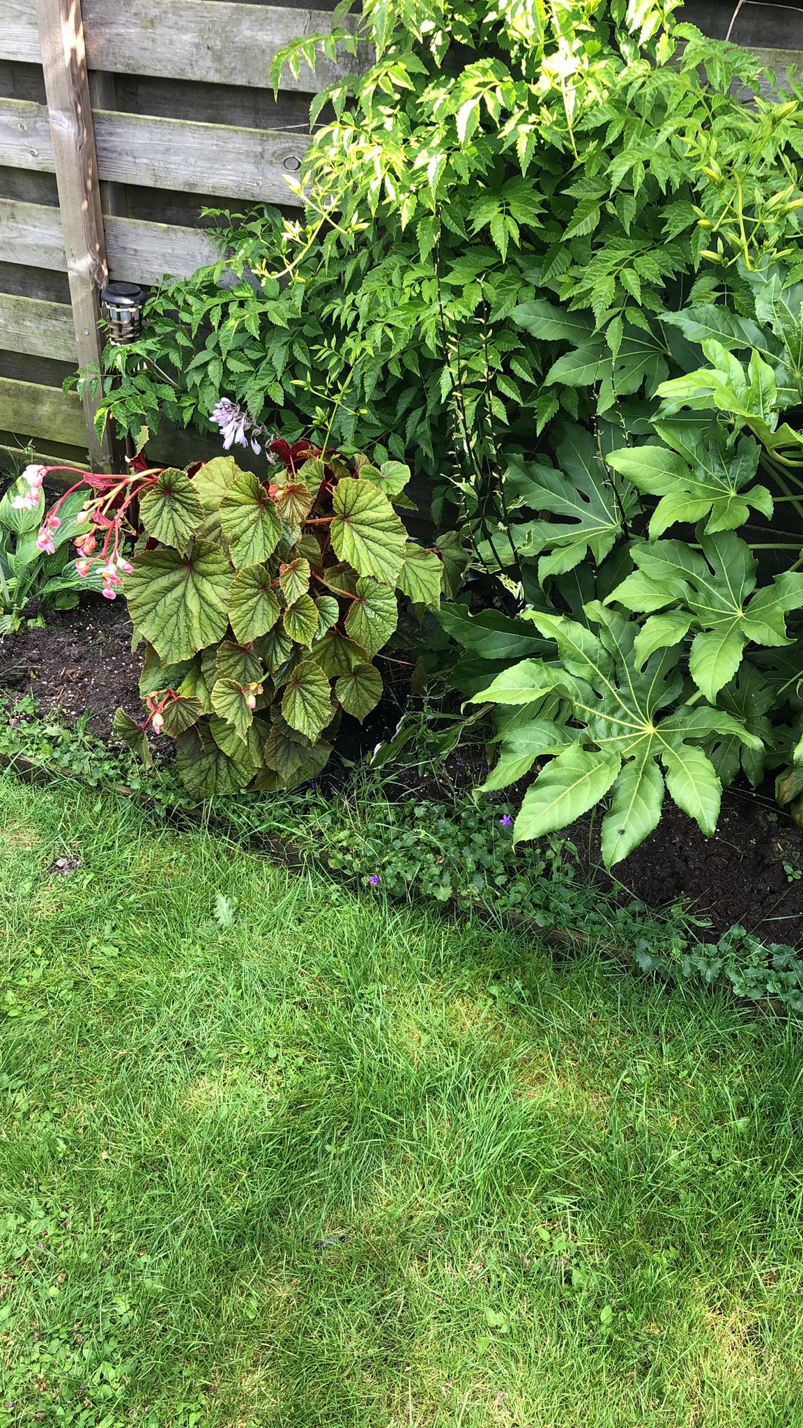 Musa itinerans var. Itinerans begint nu ook steeds sneller te groeien. Hopelijk in de herfst update al een redelijke plantje. Ik wou tussen de Begonia-Fatsia en Musa itinerans nog mijn Brugmansia Maya poten maar er zijn hier erg veel slakken en het is nog geen giga plant. Even verder opkweken nog. (oudere foto zonder de Begonia)