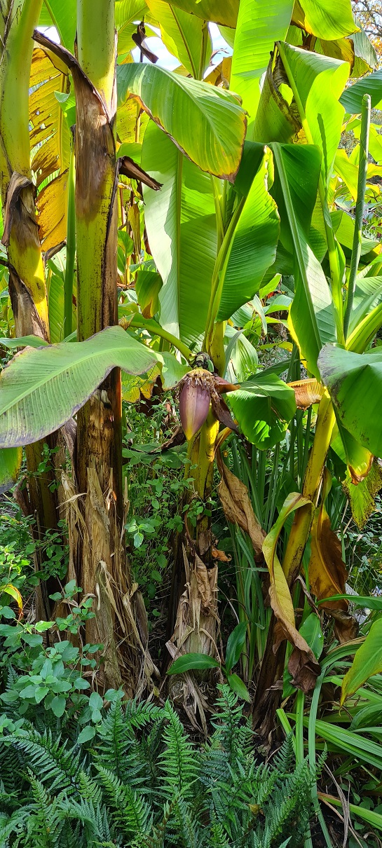 Beide stammen van Orinoco met daartussen Amaryllis belladonna. Foto is van 2 sept. Er zijn al wat banaantjes zichtbaar, maar deze zullen ws niet doorzetten omdat de stammen te weinig bladeren hebben.