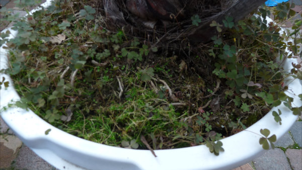 Ik heb het dode blad weggeknipt en het onkruid weggetrokken. Ik heb er gedroogde koemest POEDER (kon geen andere vinden) over gestrooid, water gegeven en cacaodoppen op de oppervlakte gestrooid (hopende dat het onkruid en mos afsterft). Over de speer heb ik een vuilniszak geknoopt als het dreigt te gaan regenen. Als de plant nu tekenen van groei gaat geven ga ik hem verpotten. Denken jullie dat dit een goede methode is?