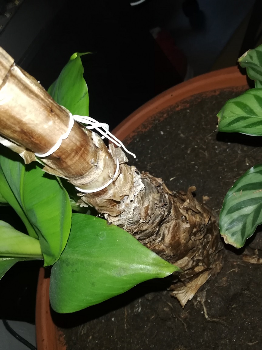 Sinds 4,5 jaar heb ik deze mooie bananenplant in huis. Heeft zelfs een verhuizing overleefd. Alle donkere stookwinters goed overleefd. Nu kreeg ik dit najaar het idee om hem 'af te pellen'. Voornamelijk waren het uitgedroogde bladstengels, maar ook een paar halfrotte natte stelen eraf gehaald tot het 'vitale gedeelte'. Aan de onderkant ondekte ik een soort basisgedeelte en heb daar niks aan gedaan. Een paar weken terug heb ik hem een mooie nieuwe grote pot gegeven. Toen kreeg hij ineens voor het eerst zijscheuten. Heel leuk! So far so good.