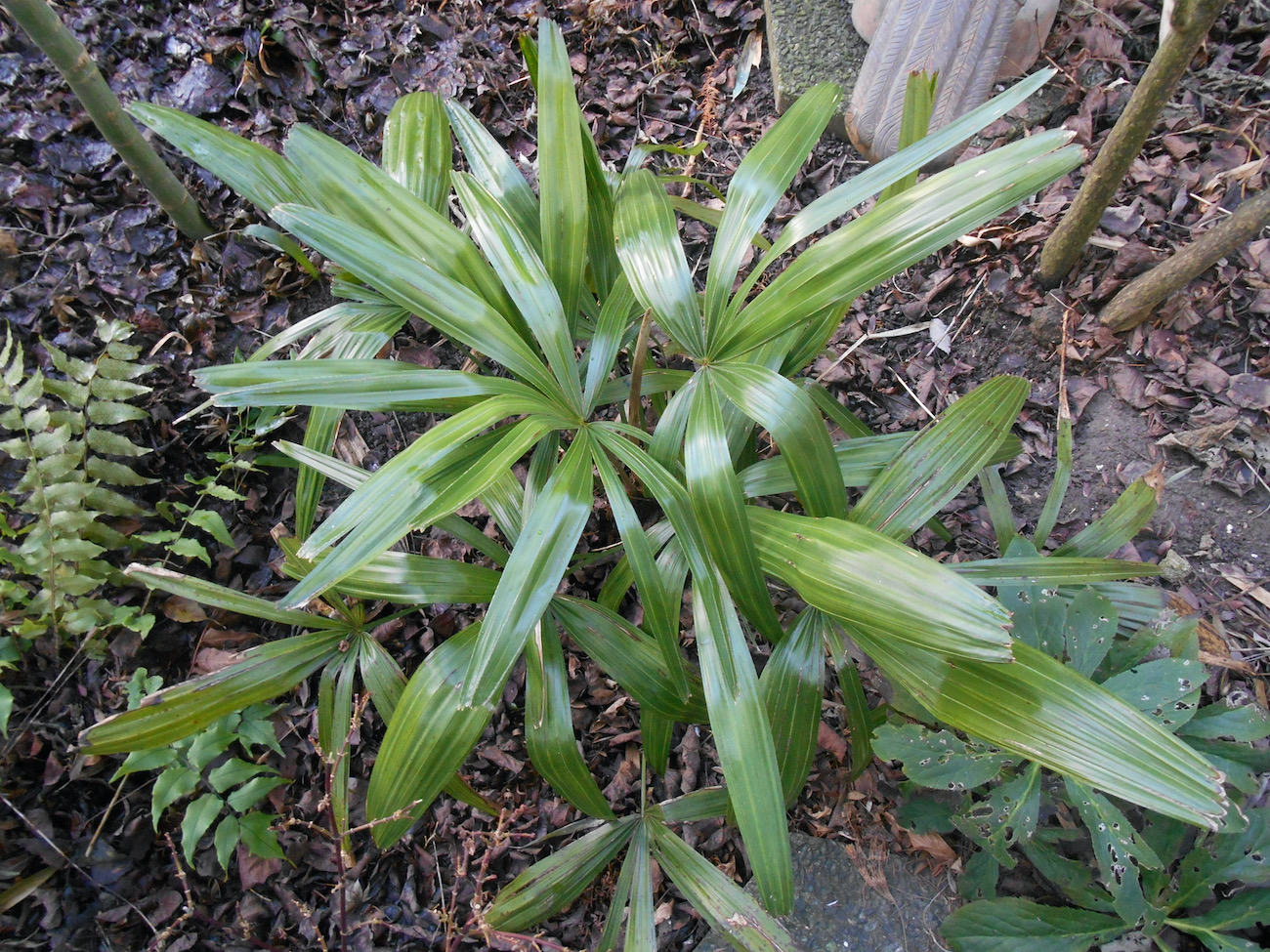 Dit topic weer even opgedoken, Hoe is het met de Rhapidophyllums? Na afgelopen winter en nu halverwege deze winter geen enkele schade weer. Eigenlijk groeit deze al sinds 2009 zonder problemen. Maar is het een spectaculair geval? Nou niet echt. Ik vind het niet echt een blikvanger. Maar ik hem m ooit aangeplant als experiment en doe er helemaal niets aan. Onlangs nog een fotootje gemaakt. De groei is nog steeds gemiddeld 2 bladeren per jaar. Maar het laatste blad rijkt met de punten ongeveer 1 m hoog nu. De zijscheuten vallen niet echt op, maar ik hoop dat die nu ook de palm een wat bossiger uiterlijk gaan geven. Hij staat bij mij redelijk onbeschut in de voortuin, dus de bladslippen knakken nogal eens.