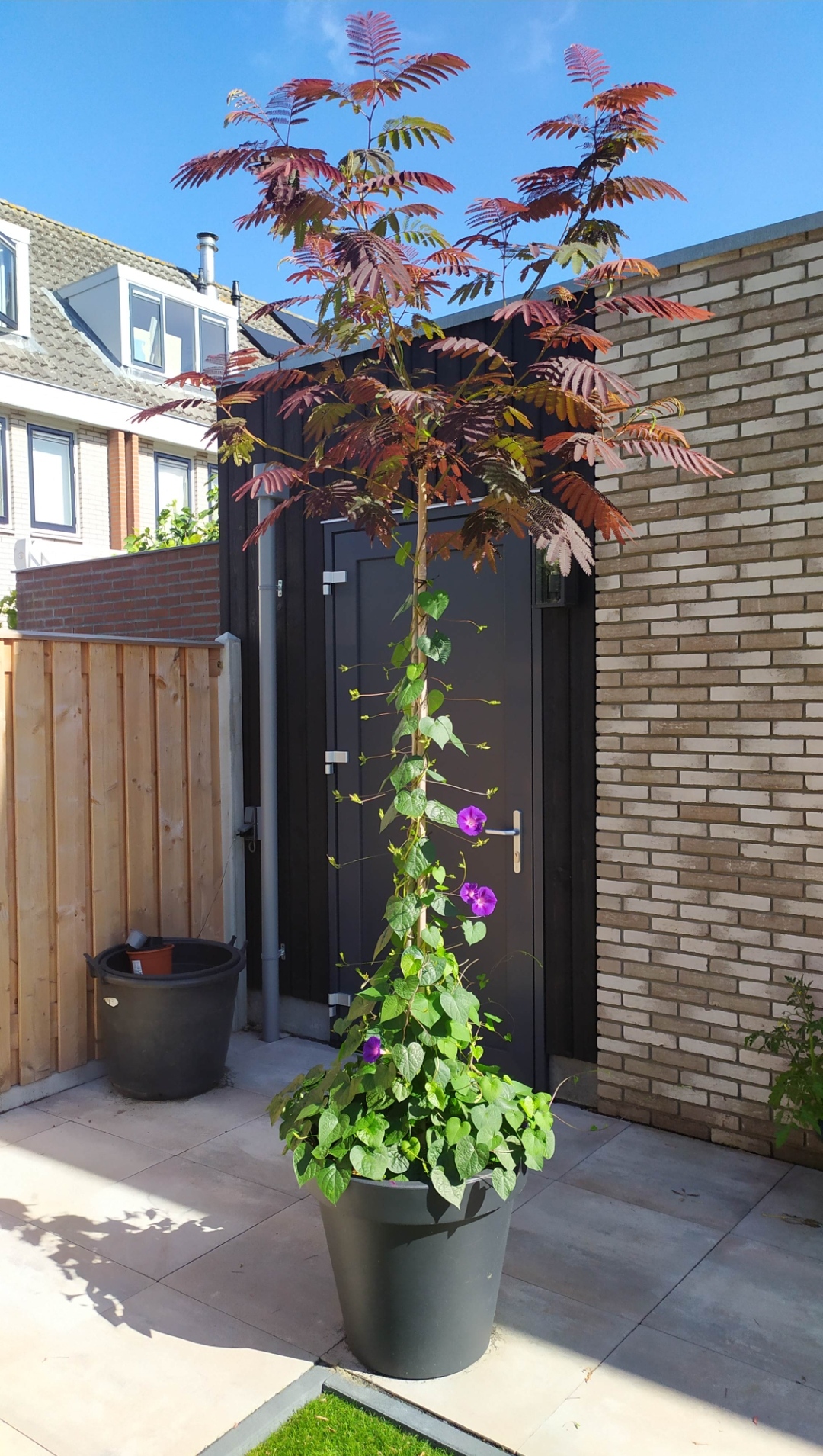 Albizia Julibrissin Evi's pride, met een klimmende winde ertegenaan.