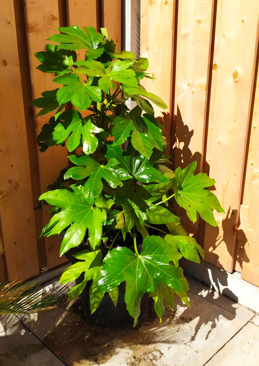 Limoen en aardbeien op de regenton, Tetrapanax ervoor.