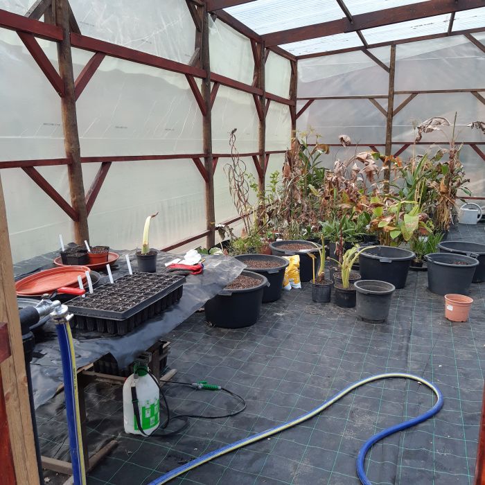 De Philodendron bipinnatifidum is ook glansrijk door de winter gekomen, zonder enige bescherming.