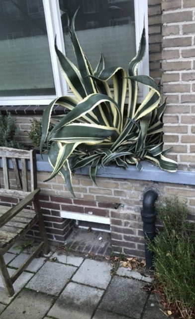 uiteraard. ze zijn uitgeplant. Maar deze hebben voordeel van een balkon erboven. De agaves van de vorige foto niet en die doen het ook goed tegen een zuidmuur in de stad.
