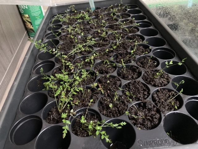 Wat kleintjes verspeend uit de zaaibakjes en opgepot in de kleine trayes zodat deze verder binnen kunnen groeien deze winter…het was hoognodig want de zaaibakjes zaten propvol