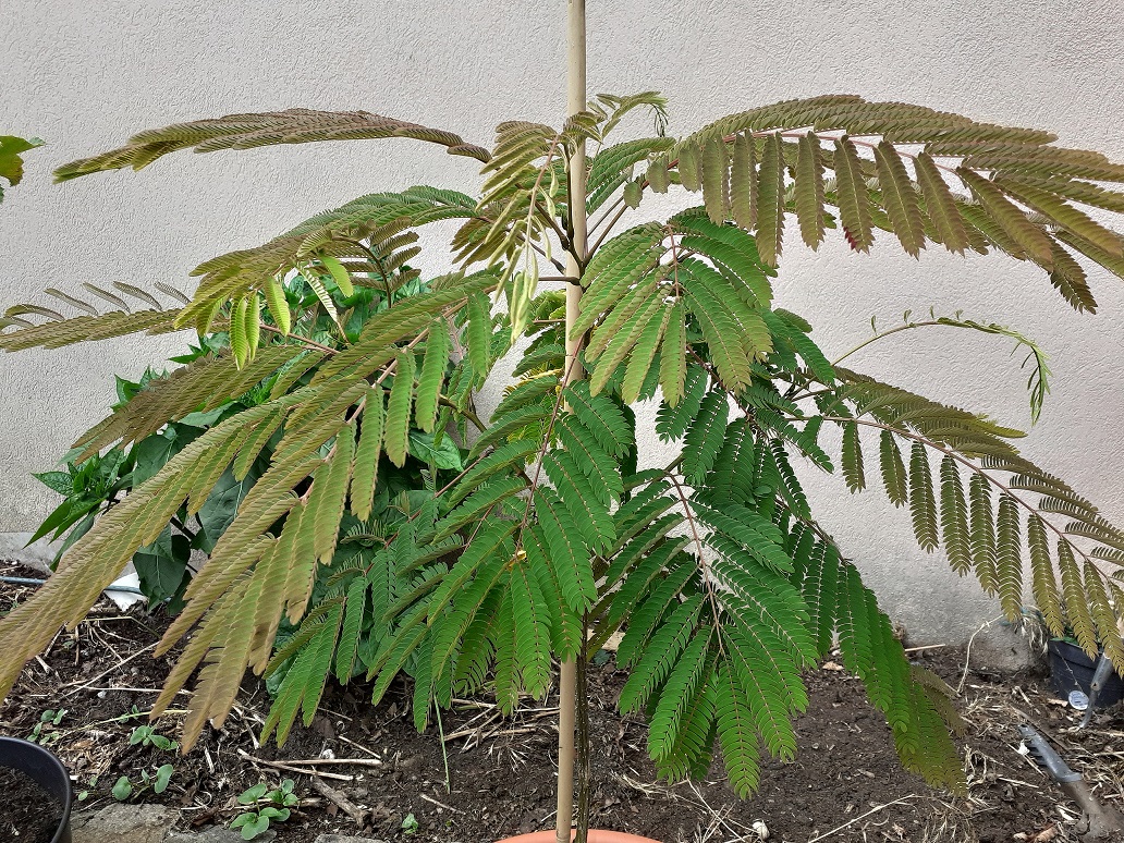Sinds een jaar heb ik een albizia boubri. Deze was nog vrij klein toen ik die kocht (circa 65 cm). Intussen is deze bijna een meter (stamhoogte).