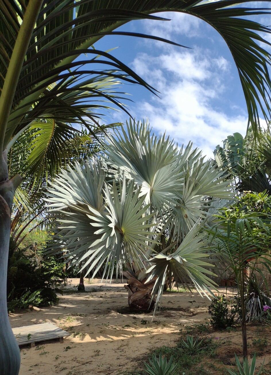 Hoi Lagarto, De grote meerderheid van onze planten zijn inderdaad helaas volledig afhankelijk van de bewatering. Dwz buiten het regenseizoen wat hier ongeveer voor een maand of 4 de kunstmatige watergift overneemt. De zandbodem in combinatie met het klimaat geven geen andere optie. Gelukkig kan ik al op veel plaatsen in de tuin de hoeveelheid wat afbouwen. Vanwege het bladerendak wat op termijn agv de groei voor de nodige schaduw zorgt. Slechts enkele soorten groeien onder de gegeven omstandigheden en kunnen zonder de kunstmatige watergift. Dat zijn oa de oudere Cocospalmen die erg diep wortelen en bij het grondwater kunnen. Gelukkig zit dat hier op slechts 6 meter, wat voor de regio relatief hoog is. Maar ook de 2 Pandanus soorten die ik hier heb staan krijgen geen water van de irrigatie. Verder heb ik zoals je zelf al noemde enkele Agave's en cactussen die ook nagenoeg nooit bewaterd worden.