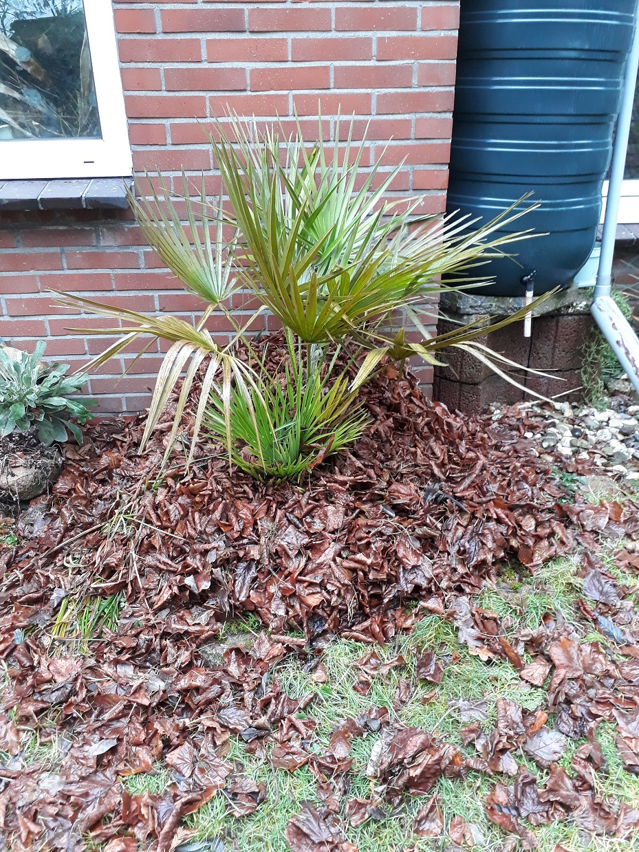 Alles intussen maar weer uitgepakt en vandaag de laatste van bladbulten ontdaan. Een aantal Chamaeropsen lijkt wat lichte bladschade te hebben op plekken waar het blad tegen de plu/kuip aan zat jammer genoeg. De twee grote met vliesmutsen bij de gevels niet. Maar wat me meer verraste, was dat de Chamaerops onder de bult bladeren al direct bevroren blad liet zien tijdens de vorstweek. Dat verraste me omdat deze plant in kuip al twee winters hier heeft gestaan en vorst heeft gezien, zonder zichtbaar effect.