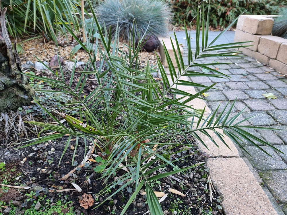 Een goede tolerantie tegen vorst is echter totaal geen garantie dat een plant ook een goede winterhardheid en een goede tuinprestatie in een Nederlands klimaat heeft. Hiertoe heb ik ook meerdere kleinschalige veldtesten gedaan waarbij verschillende Phoenix soorten worden vergeleken. Zie hieronder een aantal foto’s van het verloop van één van de proeven. Deze zaailingen zijn in het voorjaar van 2017 geplant in de volle grond in Drunen aan de noordkant van een woning waardoor er relatief weinig direct zonlicht is. In het proefveldje staan drie zaailingen van canariensis, theophrasti Epidaurus (Populatie 1 en 2), dactylifera Medjool en theophrasti Golkoy. De planten hebben water gekregen gedurende de eerste zomer om aan te slaan en zijn nooit beschermd geweest in de winter. De eerste winter was direct een zeer goede test voor de jonge zaailingen. In de winter 2017-2018. In februari zakte de temperatuur zakte tot onder de -10 met meerdere ijsdagen op rij. In het voorjaar van 2018 waren alle palmen gestorven op twee Epidaurus (populatie 1) zaailingen na. Deze herstelde prima in de opvolgende zomer en hebben sinds de eerste winter nooit meer vorstschade vertoond. Ook na de recente vorst is er geen schade te zien. De groei is beduidend langzamer dan Epidaurus palmen die bij ons in de kas zijn aangeplant in hetzelfde jaar. Een hogere zomertemperatuur en veel direct zonlicht versnelt de groei bij deze palmen. Recentere vergelijkbare veldtesten op meerdere locaties in Brabant geven vergelijkbare resultaten.