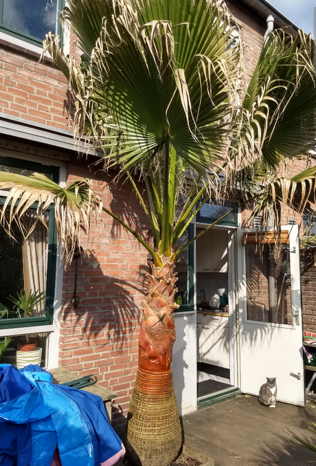Er komt een 4x3m pergola over met trapje naar verhoogde houten vloer (+50cm), zodat ie over de stomp komt te liggen. Afwerking zal met bamboe, bamboemat en donker sloophout zijn. Intentie is om het dak niet waterdicht te maken, zodat schaduwplanten (denk met name Chamaedorea, varens) eronder in de zomer af en toe nog wat water krijgen, zonder dat ook daar weer een gieter aan te pas komt.