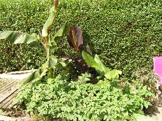 kleinste vak met donkerbladige canna,musa velutina en musa ? op de voorgrond laagblijvende snoeptomaatjes