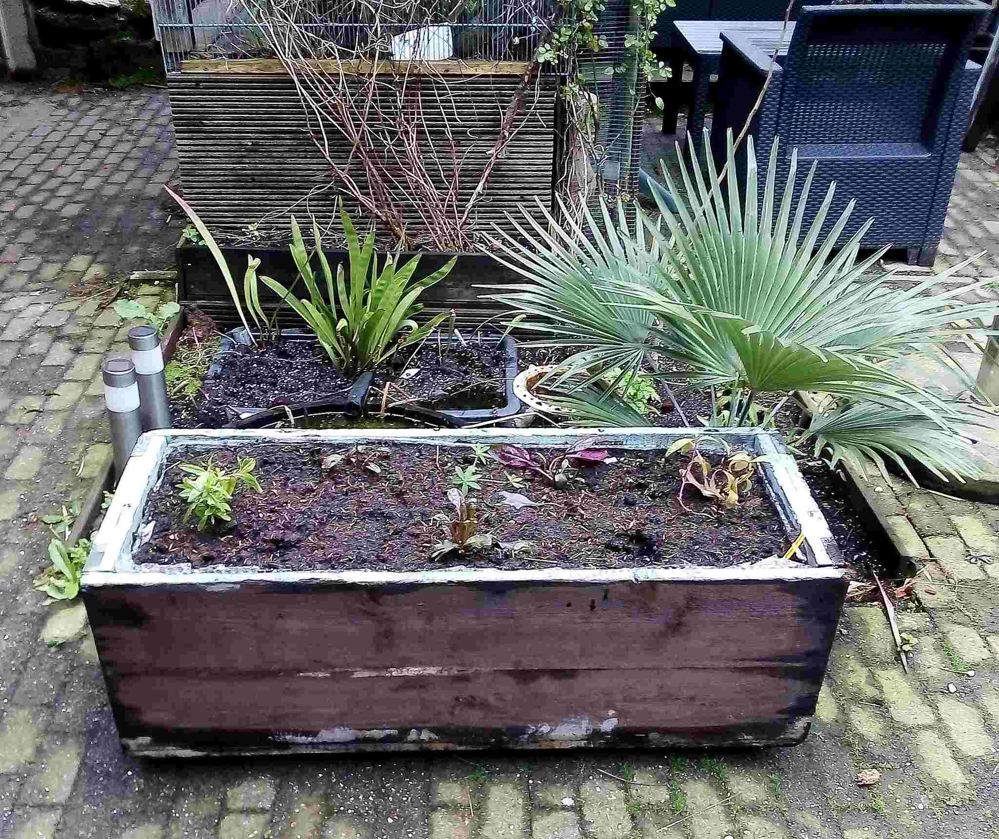 Een kleine update met nieuwe werken. Rechts achter staat een lange muur. Daarvoor had ik coniferen staan maar daar de muur de zon blokkeert, staat op zuiden dus zon kon niet aan deze kant van de coniferen, heb ik beslist deze eruit te gooien. Daar nu nieuwe aanplant van al bestaande bamboes die ik had staan. De grote blok, niet op foto te zien staan achter de basjoo op andere foto's , heb ik langs achter open gezet richting die muur zodat die zich ook naar daar kan verspreiden. In het hoekje, achter de fatsia, staat nu arundo donax met aan terraskant begrenzer dus die kan zich ook mooi uitleven in dat hoekje in de toekomst. Voor de rest gelukkig mijn princepsen die het goed doen net als de latisectus. Tevens 4 palmen verplant naar de kant waar de coniferen weg zijn, daar ik dat paadje niet meer nodig heb dat daar liep kan alles mooi dichtgroeien in de toekomst. Helaas geeft het nu nog een kale indruk. Ik ga deze zomer eens alles vol met bloemen zetten. Je ziet ook spotty dotty opkomen uit de grond.