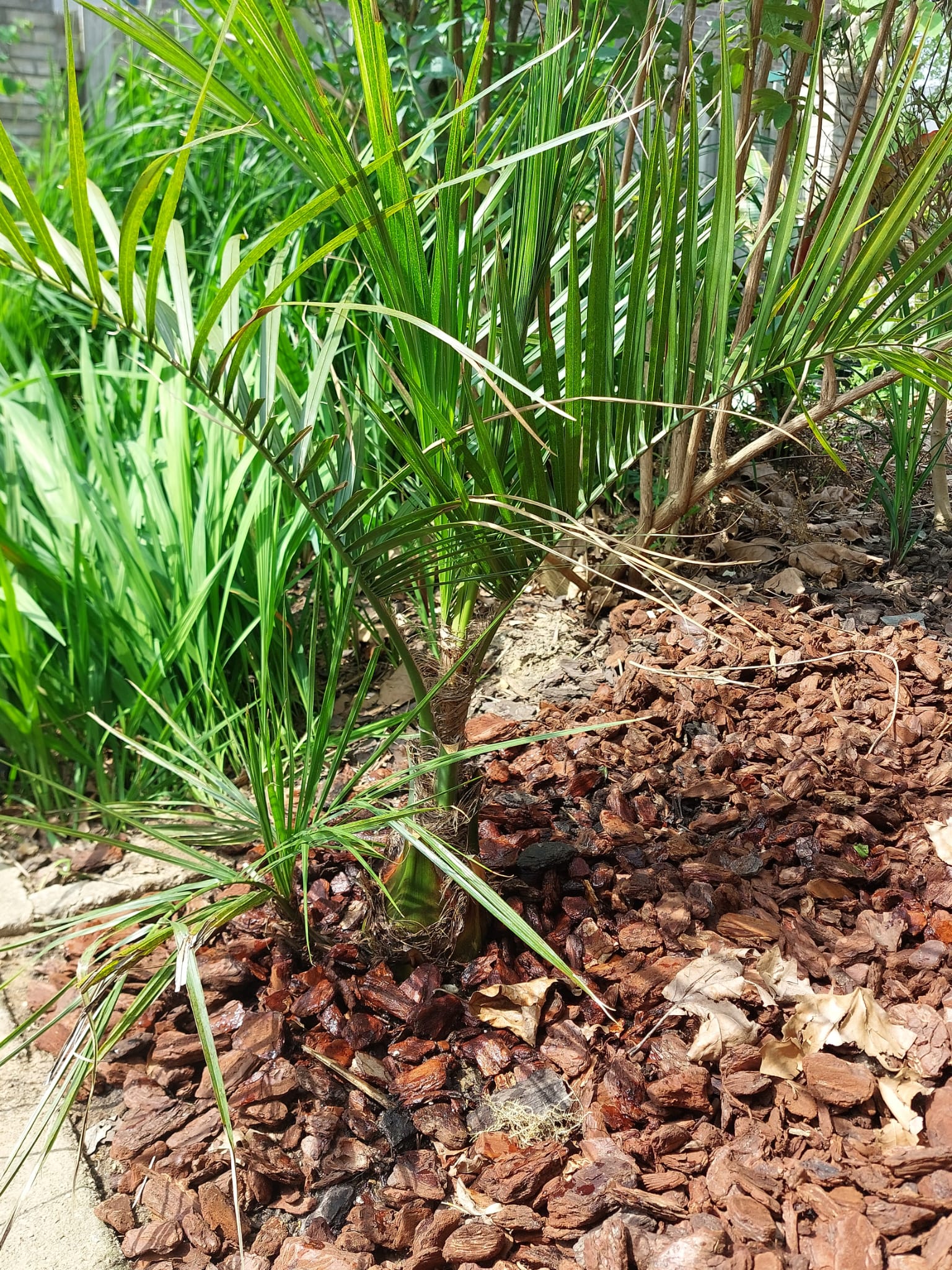 Ik denk dat het door de schors komt. Misschien moet de schorslaag wat dunner gemaakt worden om de palm zelf. Straks maar eens wat harken.