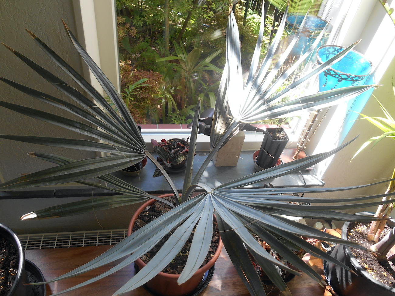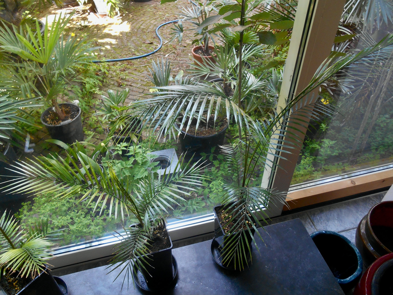 Het liefste verhuis ik alle kamerplanten in de zomer naar buiten, maar sommige tropische soorten houden niet van sterk wisselende temperaturen. In de buitenlucht hebben kamerplanten minder last van plaaggedierte met name spintmijt. Tot nu toe blijven de meeste palmen in huis gezond. Chamaerops elegans en Gaussia princeps zijn naar buiten verbannen vanwege respectievelijk thrips en spint.