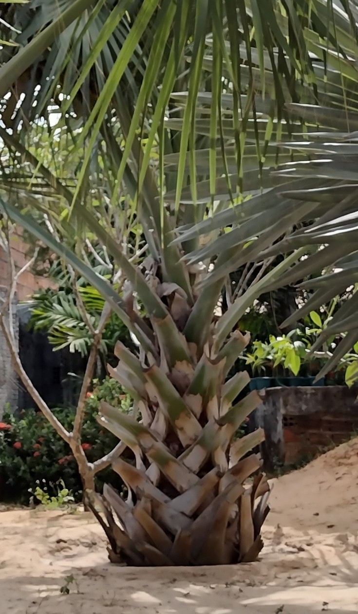 Stammetje Sabal Causiarum is ongeveer 2 meter hoog en een meter breed. Begin dit jaar kon ik als ik op me tenen ging staan nog de dikke nieuwe speer voelen. Kan er nu niet meer bij