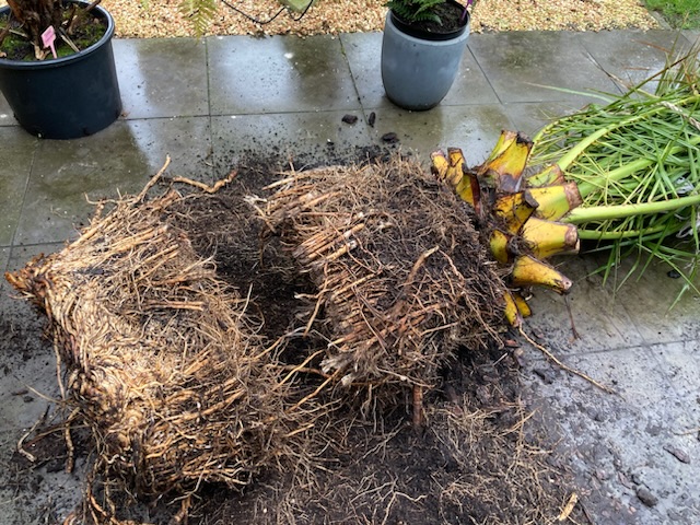 De Phoenix canariensis Kuip 85liter was volledig doorworteld na 2 jaa geleden wortelsnoei te hebben gegeven… vandaag terug wortelsnoei gedaan en opgepot in 130 liter kuip