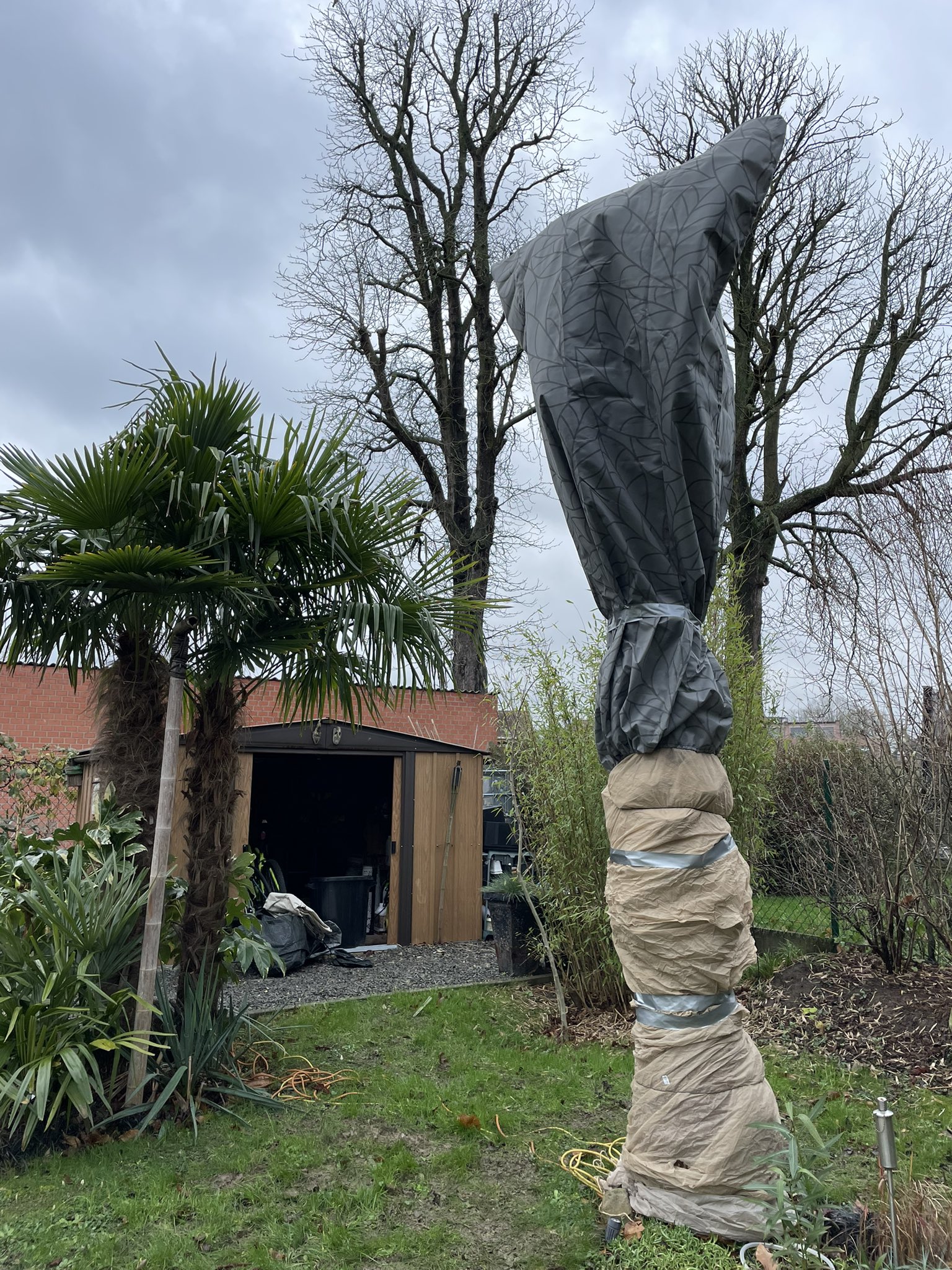Wel denk ik dat het één van de laatste jaren is dat het nog zo lukt en dat ik nadien gewoon alle bladeren verwijder en de speer gedeeltelijk top om hem zo in te pakken. En dat enkel indien er echt temps richting de -6°C voorzien zijn. Het is anders niet meer haalbaar op redelijker wijze. ;)