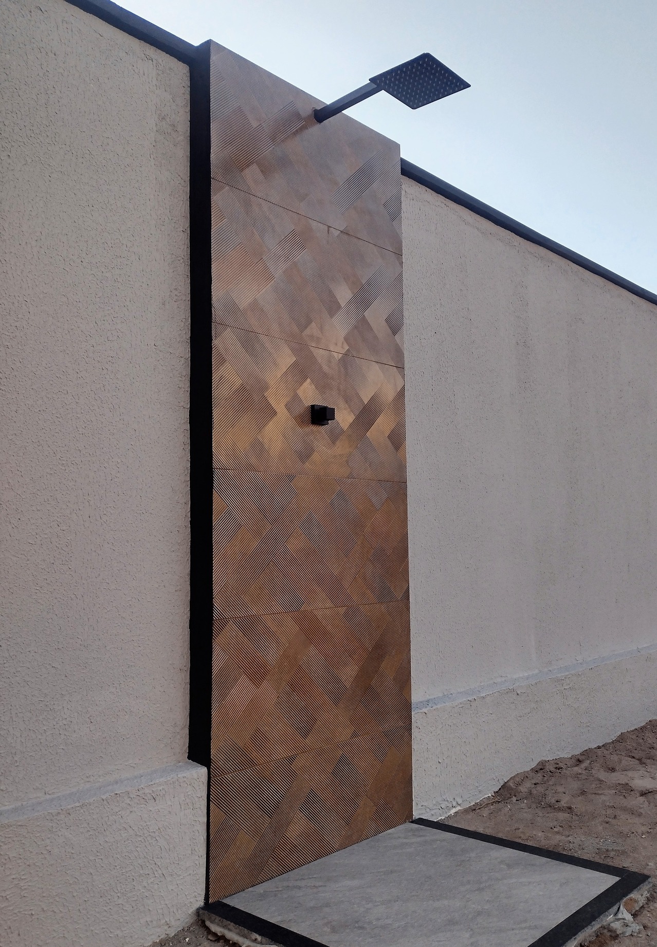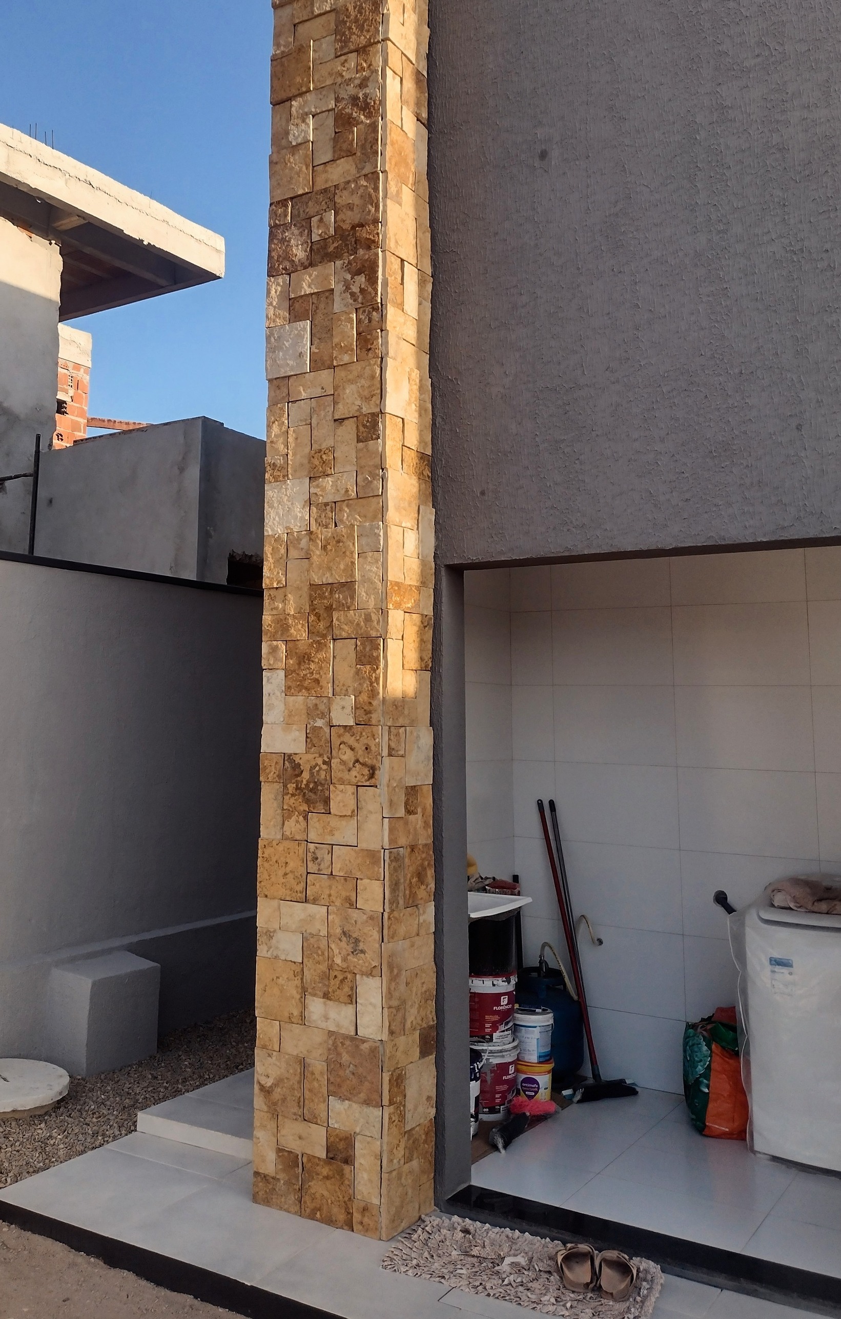 Inmiddels ligt er trouwens gras en zijn enkele elementen van de achtergevel met natuursteen bekleed, is er een buitendouche gebouwd en is het pad naar de voordeur met porselein bekleed.