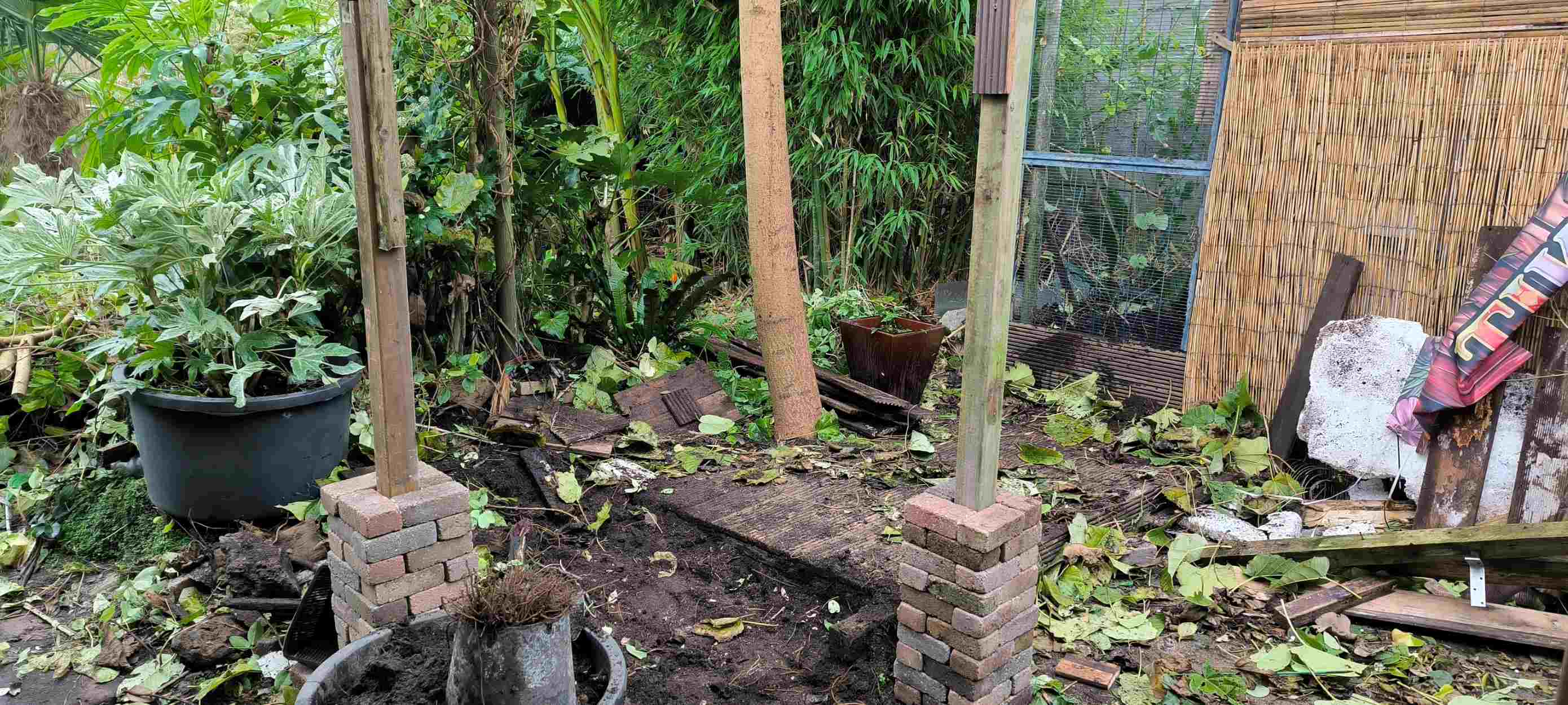Wel zoals aangehaald een groot project gestart paar weken terug. Bedoeling is de tropische bar te verhuizen naar de grote boom, past er juist tussen, en dan die ruimte ervoor volledige overdekken zodat je bij regen ook daar kan zitten recht voor de bar. Zo wordt mijn groot terras terug vrij en komt er zon binnen in mijn huis aan die kant. Hopelijk volgend weekend kan ik de bar verplaatsen en opruimen