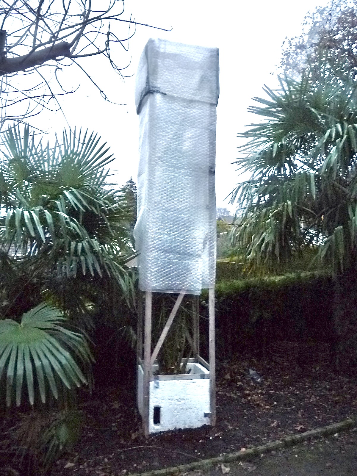 Emmer + bamboemat + puinzak is essentieel - dan waait die zak niet weg en blijft palm vrijwel 100% droog.